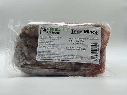 Tripe is a nutrient-dense food that dogs love, packed with essential vitamins and minerals that promote digestive health. At Raw Dogs Dorset, our raw tripe mince products are sourced from Southcliffe Foods for their quality and freshness, ensuring your dog enjoys a tasty and nutritious meal. Whether served on its own or mixed with other proteins, tripe is a great addition to any raw diet.