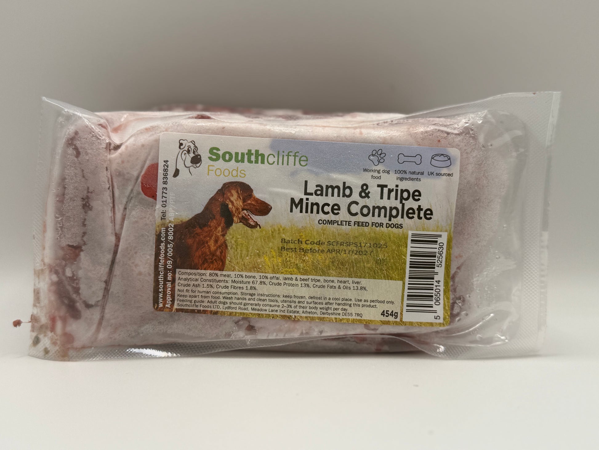 Southcliffe Foods’ Lamb & Tripe Complete Mince is made with 100% natural ingredients, sourced in the UK and prepared to provide a balanced and nutritious raw meal for your dog. Each block combines high-quality proteins, bone, and offal in the ideal ratios for a complete BARF diet - no additives, fillers, or grains.