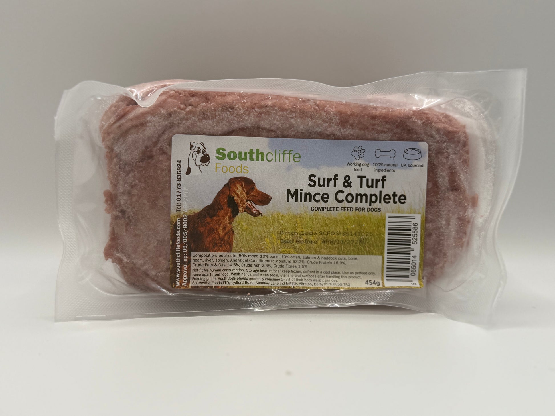 Southcliffe Foods’ Surf & Turf Complete Mince is made with 100% natural ingredients, sourced in the UK and prepared to provide a balanced and nutritious raw meal for your dog. Each block combines high-quality proteins, bone, and offal in the ideal ratios for a complete BARF diet - no additives, fillers, or grains.